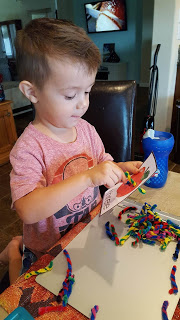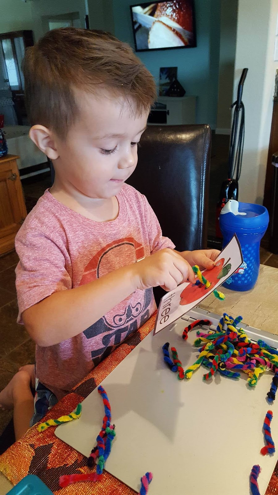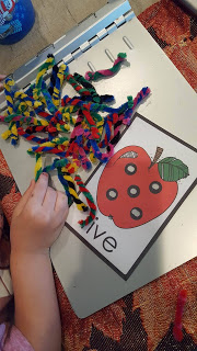 The next activity was using apple number cards that I hole-punched to create worm holes. We made “worms” out of pipe cleaners and then he stuck the worms through each hole. It was so funny listening to him sing his own version of “The Farmer in the Dell” as he poked them through the apple: “The worm’s sticking out, the worm’s sticking out. High ho the dairy oh, the worm’s sticking out!” How precious, as I like to say!
