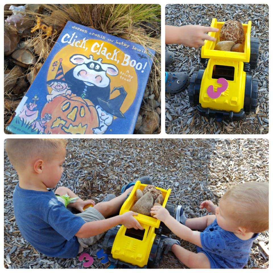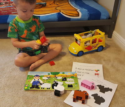 We began the week simply enough with some retelling using Maddox’s toys. We don’t have a truck that could hold all of the animals together as they ride away in the story, so it was fun to watch Maddox tell his version so that the dump truck gave everyone a ride in the end.