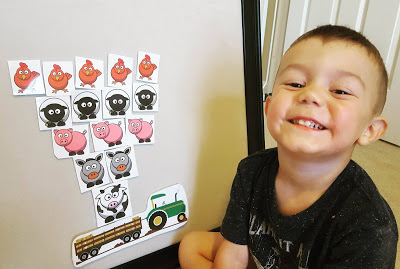 I came across the song on YouTube and we have gotten a lot of mileage out it over the years. I printed off some animal pictures and a tractor and then attached felt to the back so they would stick to the flannel board. I love singing the song and it was a quick and easy way to introduce and reinforce counting that was also fun for a toddler. It didn’t take long for my enthusiasm to rub off on Maddox and he began singing right along with me. But just as I mentioned last week with the Five Little Pumpkins activity, he is now well beyond counting to five, so while he’s outgrown its usefulness, he does still light up when he sees it come out because we have so much fun!