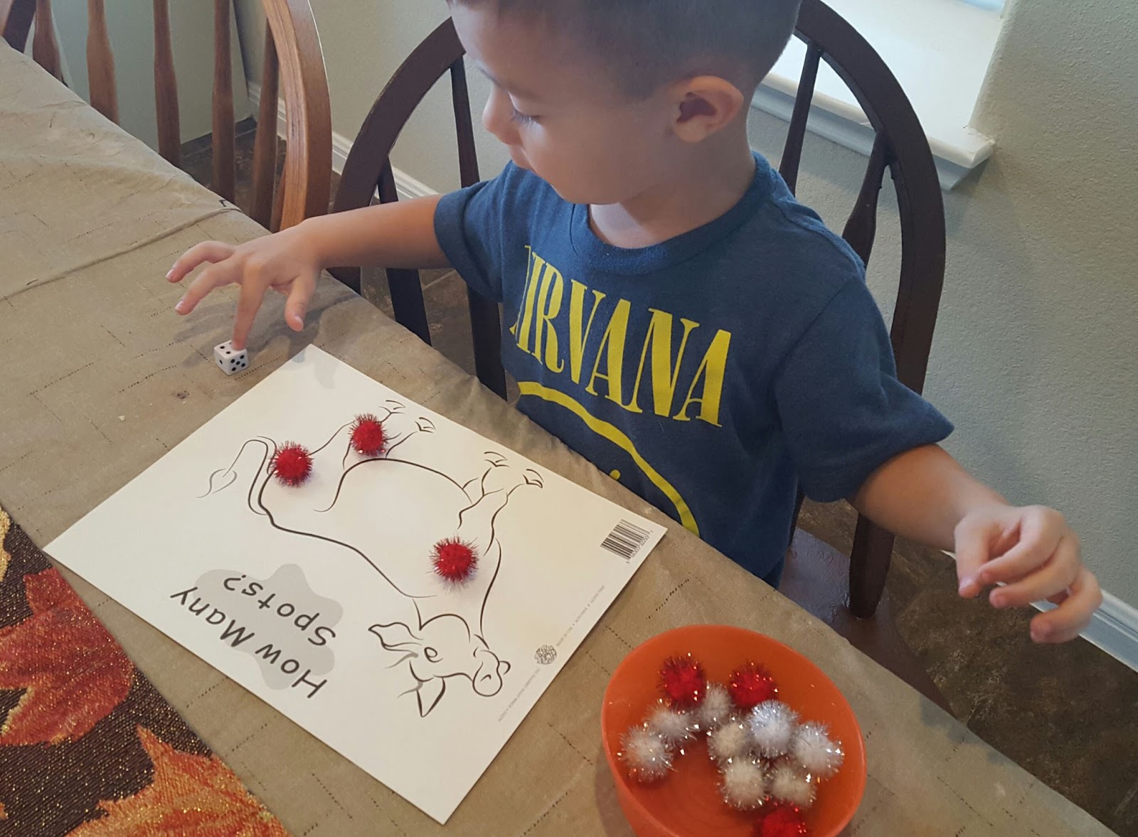 We also played a dice game called How Many Spots on the Cow? that was inspired by The Preschool Experiment. This is another one of those great activities that keeps the kids busy while you do something else. Minimal prep and little supervision. JDaniel4’s Mom also had a similar game using a blue truck printable and small farm animals. Additionally, Fun-A-Day features a similar game using a pig and unifix cubes.