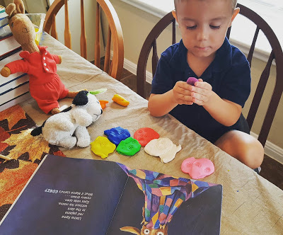 We then read Llama Llama Red Pajama and made a playdoh patchwork quilt for our Llama Llama doll. I love that he keeps asking for this all the time. He even used it to create different kinds of monsters for over an hour one morning.