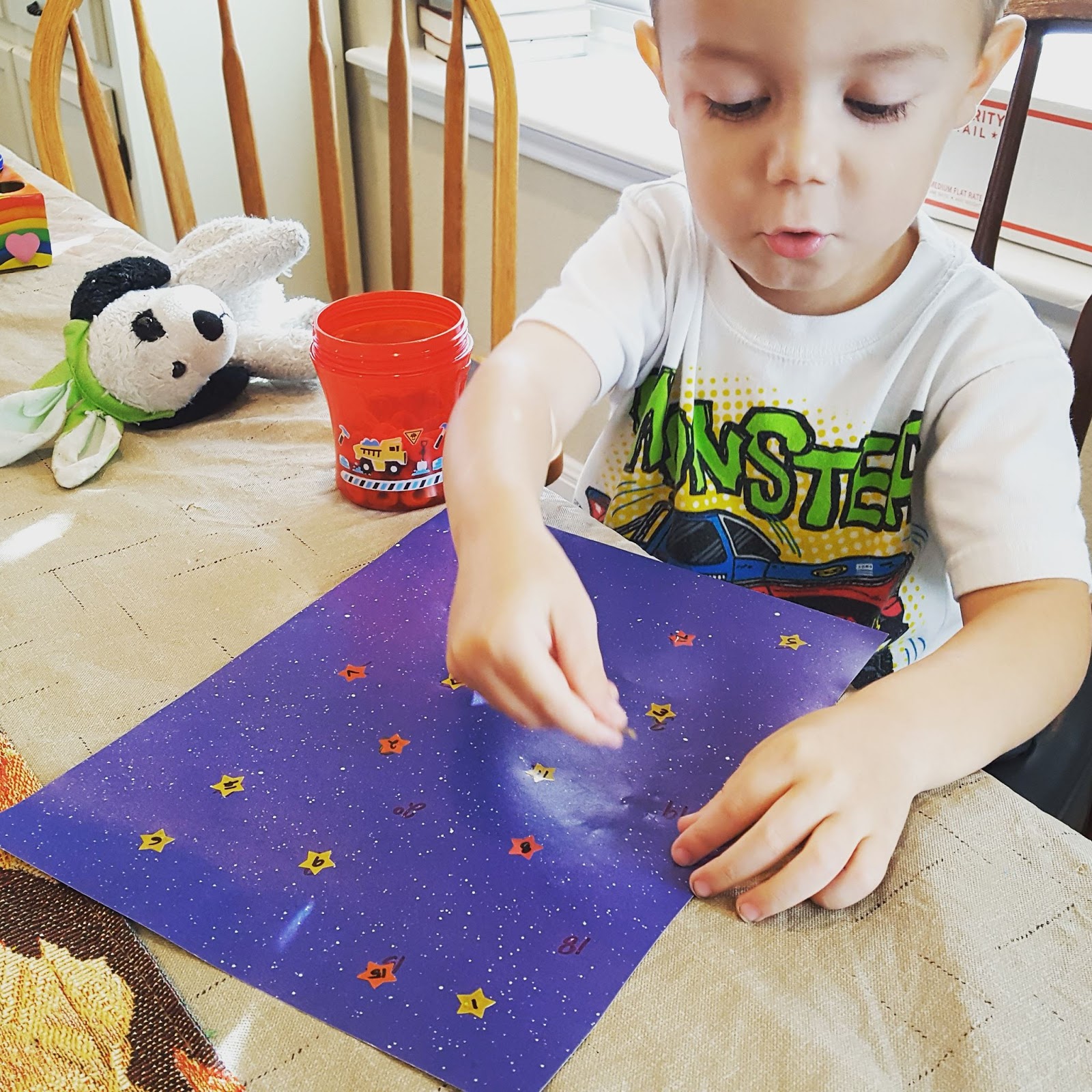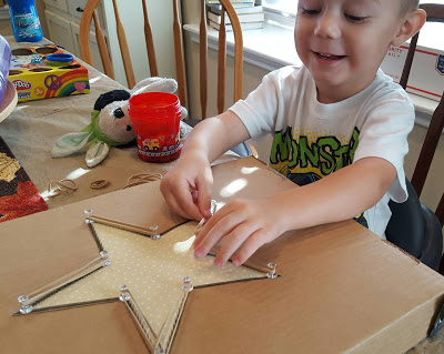 Toddler Approved offered some great pre-writing activities featuring stars that we tried. Ever the improviser, I jerry-rigged a geoboard using one of the many thousands of cardboard boxes that we have in our garage. These activities are great ways to develop fine motor skills! And they kept him reasonably occupied. He even started singing the entire “Twinkle Twinkle Little Star” song at one point and it was so beautiful!