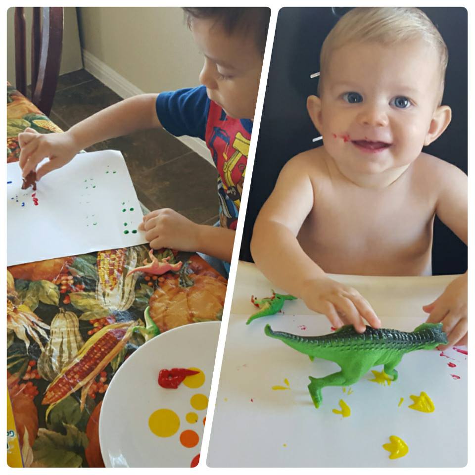 Later the boys used the dinosaurs to paint tracks.
