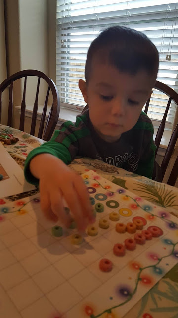 Then we did a math activity using fruit loops from PreKinders! I gave Maddox a bowl of Fruit Loops, which he used to decorate the house printable. After he had it the way he wanted, he placed each cereal on the graph to sort which color he ended up using the most.
