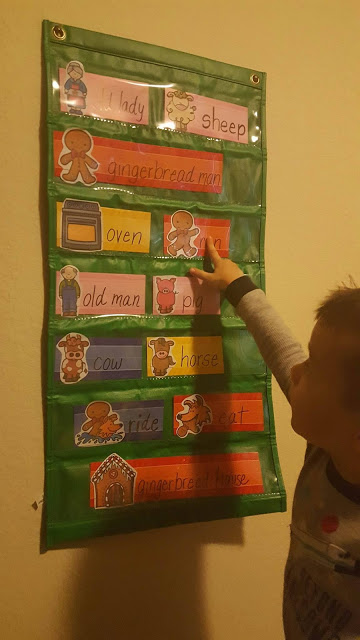 This week, I introduced a word wall after reading the story to the boys. Maddox has been showing signs of early reading for a while now and I thought putting key words from the story on his wall, so he could see them during the week would be a great reinforcement tool. I was surprised at how well he responded to it! He enjoyed putting them in the pockets and talking about the words each day.