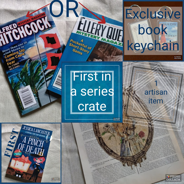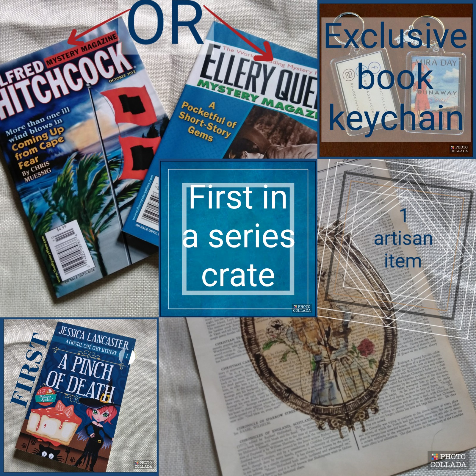 First in a Series box is the first book in a cozy mystery series, either an Alfred Hitchcock or Ellery Queen magazine, an exclusive keychain, and 1 artisan item.