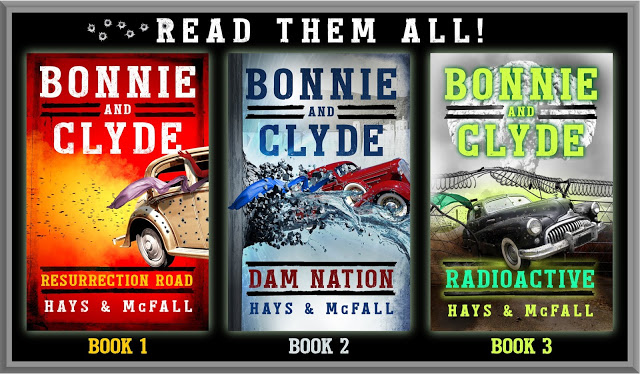 Bonnie and Clyde: Defending the working class from a river of greed. It’s January 1945, the height of World War Two. As the bloody conflict drags on, America has undertaken a massive top-secret effort to unleash the power of the atom and develop the first nuclear bomb. A network of Nazi and Soviet spies is determined to steal the technology, or failing that, sabotage the project. But first, they have to get past Bonnie and Clyde. In a heart-pounding adventure spanning the windswept landscapes of eastern Washington to an isolated internment camp in the California mountains, Bonnie and Clyde face deception at every turn. Can the former outlaws put aside their desire for revenge long enough to help end the war? As in Resurrection Road and Dam Nation, the story cuts back and forth between 1984 where Royce, a washed-up investigative reporter, teams up with the now-elderly Bonnie Parker to hunt down the truth about their past, and the 1940s undercover exploits of the young Bonnie and Clyde. And in Radioactive, Royce and Bonnie finally discover the devastating truth: Who Sal — the brains behind forcing Bonnie and Clyde into covert service defending the working class all those years ago — really was.