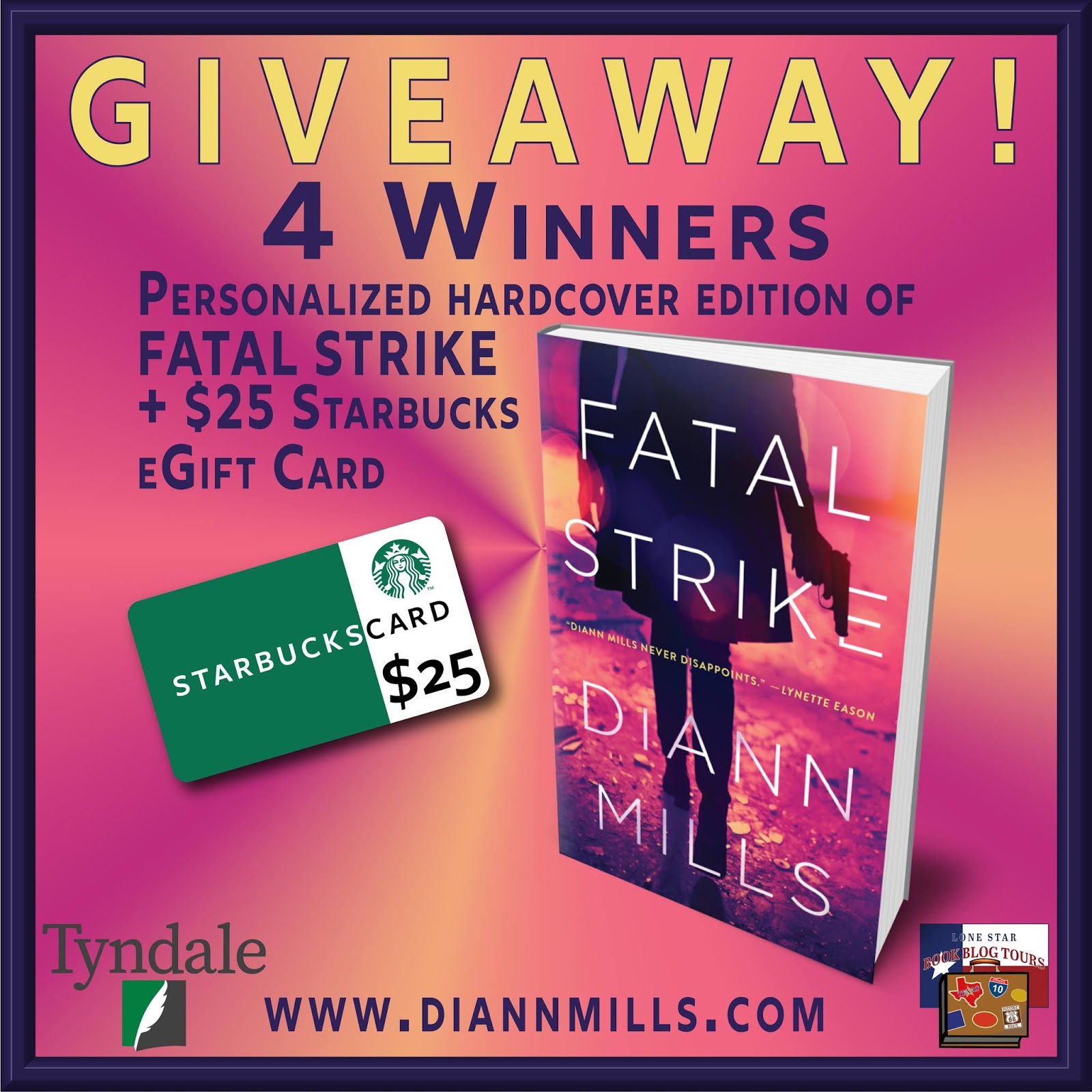 Many thanks to Lone Star Book Blog Tours and DiAnn Mills! It was a pleasure reading, reviewing, and hosting! And be sure to check out the other stops on the tour for more opinions and extras!