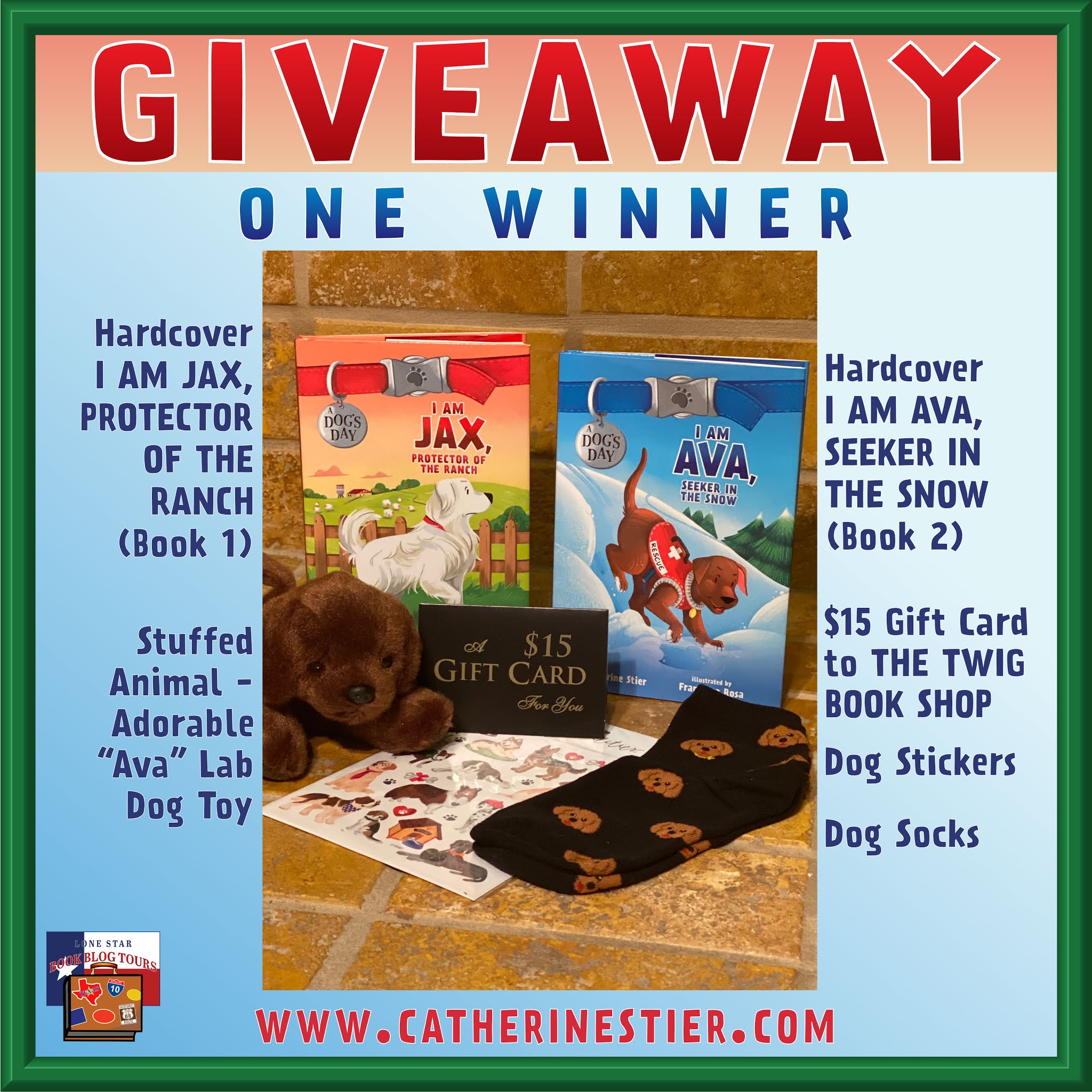 Hardcover copy of I Am Jax, Protector of the Ranch (Book 1), hardcover copy of I Am Ava, Seeker in the Snow (Book 2), $15 gift card to The Twig Book Shop, stuffed animal – adorable “Ava” Lab dog toy, dog stickers, dog socks.